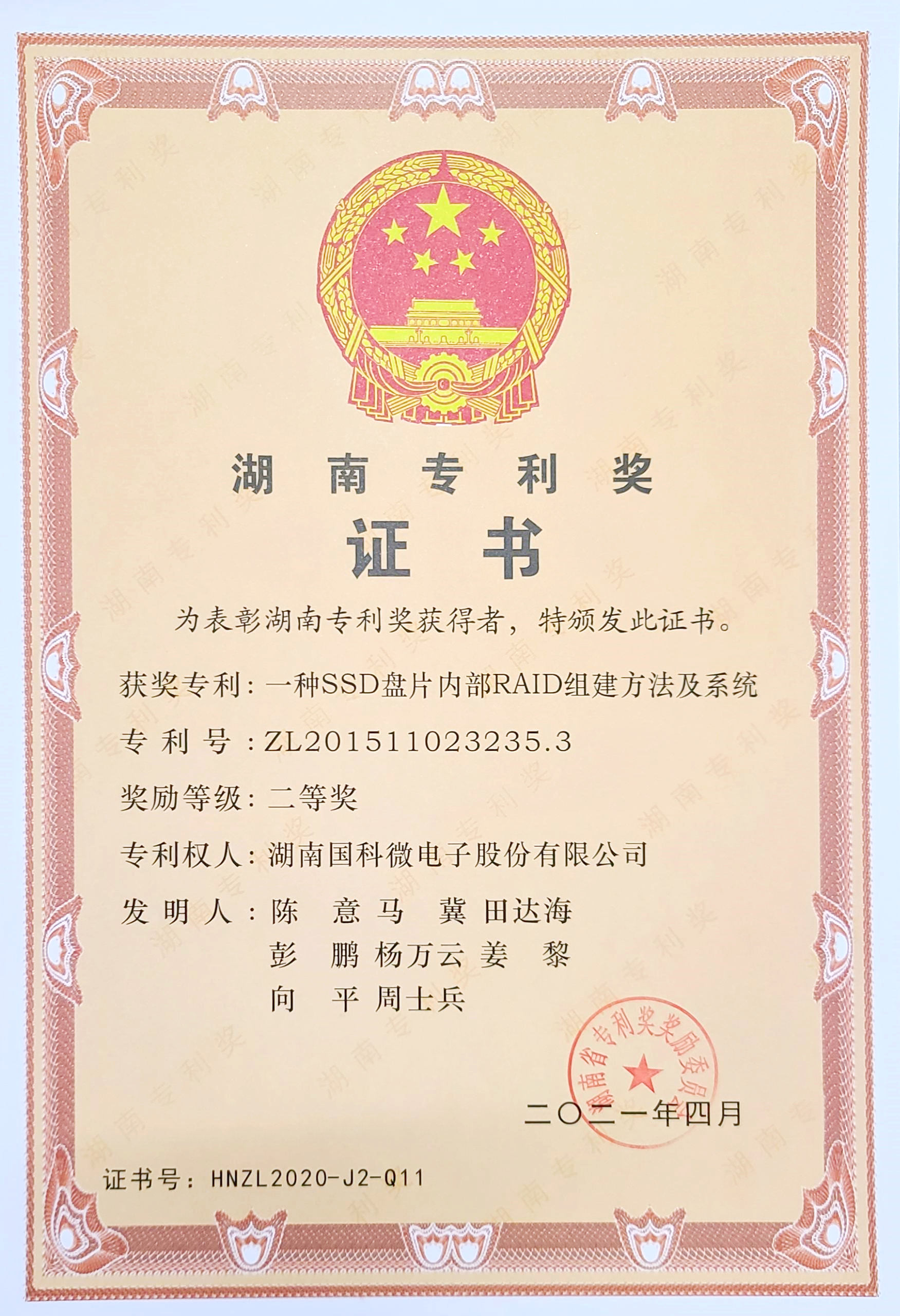湖南专利奖证书